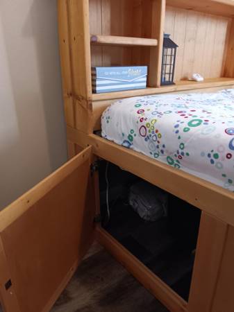 Nice, clean, well taken care of solid pine twin size bed with four drawers. The matress is clean and was always covered with a matress pad. Will sell without the matress for $250. 9two8 two87...