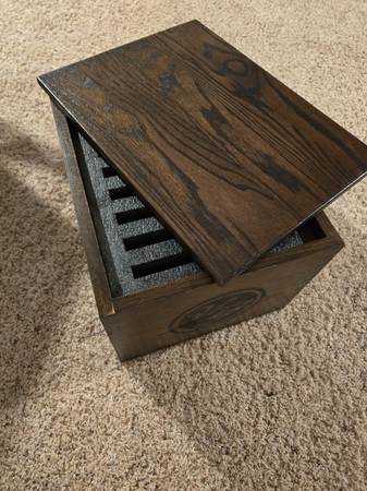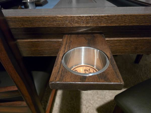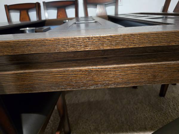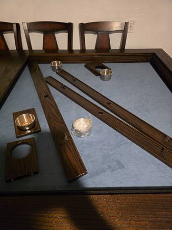 Large dining/game table manufactured by Uniquely Geek. The table is also a gaming table for board games and or puzzles. The leaves on the top of the table can be removed to reveal a recessed play area. The inside play area has a removeable piece in side and is covered with crushed velvet on one side and speed cloth on the other depending on what you want to do. The leaves can be stored in the included box. The table also features a magnetic rail system around the outside of the table for 4 included cup holders. The table seats 10 people comfortably and comes with the chairs that were purchased separately from Ashley Furniture. The inside play area of the table is 4’x6’. The table as a whole measures 31” tall, 82” long just shy of 7 feet, and 58” wide just shy of 5 feet. Feel free to call or email with questions.
