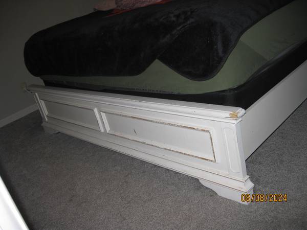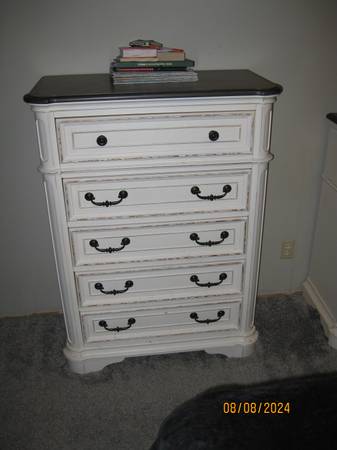 This bedroom set has been in use for 1 year. Like new condition. Antique oyster shell finish, Off white ?