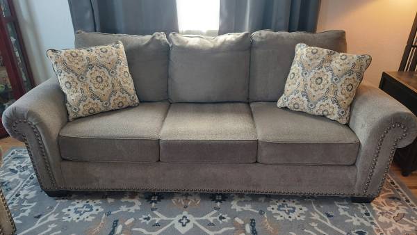 Price reduced. Must sell! Sofa and matching loveseat. Color pewter. Includes four matching accent pillows. No rips, no holes, no stains. Very good condition. Call or text.